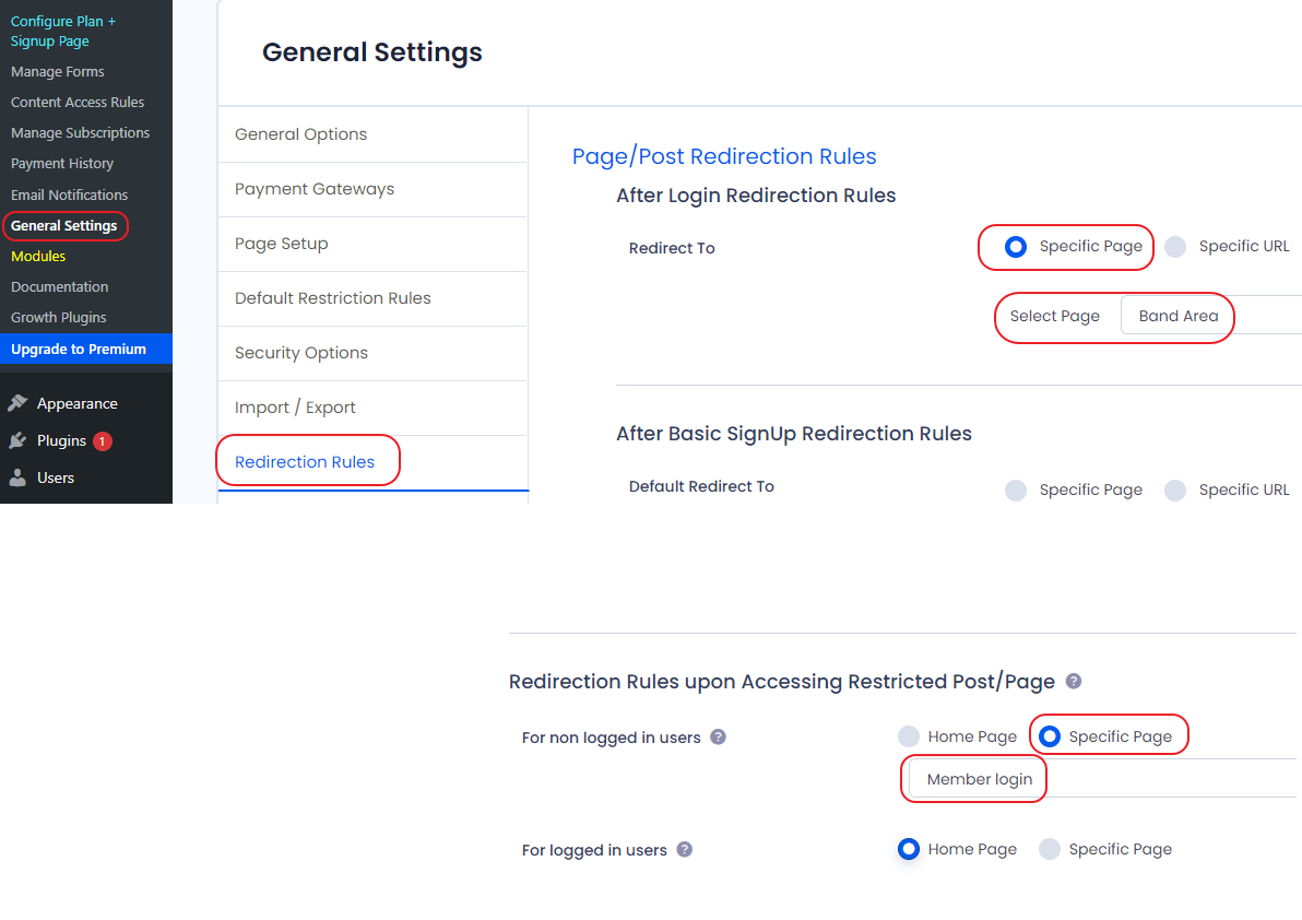 Lastly set the redirection rules to the member login and member area pages. To do this, in the menu on the left, click 'ARMember lite' -> 'General Settings' -> 'Redirection Rules' and set the following 2 rules: